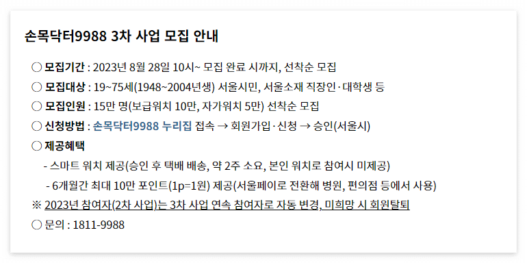 이제 '손목닥터9988'와 함께 건강한 습관을 만들어보세요! 지금까지 참여한 시민들 중 85%가 건강 개선을 느꼈다고 합니다. 지금 3차 모집이 시작되었으니, 서둘러 신청해보세요. 서울시민 모두의 건강한 삶을 응원합니다!