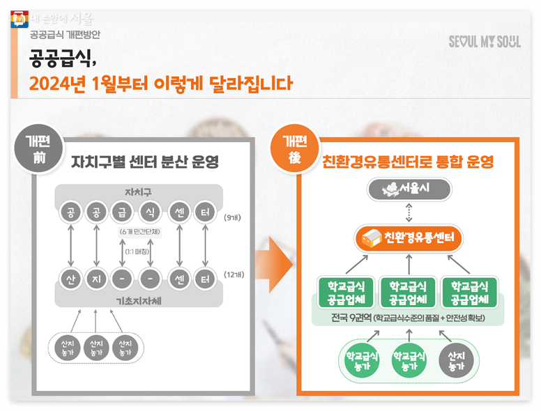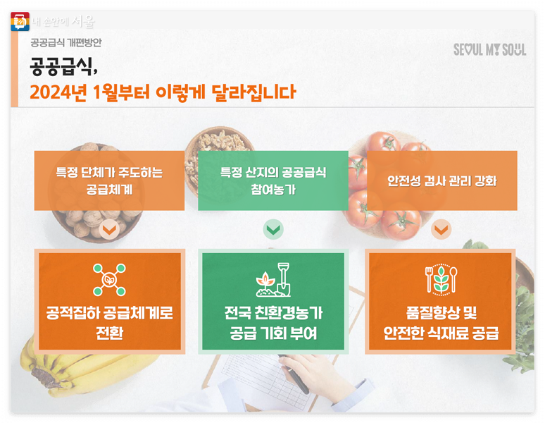 서울시는 '공공급식 체계 개편(안)'을 발표하여 어린이들의 밥상을 더 안전하고 건강하게 챙긴다는 목표로 공적집하 공급체계로의 전환, 전국 친환경농가 공급 기회 부여, 품질향상 및 안전한 식재료 공급 등 3가지 방향을 제시합니다.