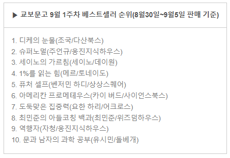 이번주 순위에는 '디케의 눈물'과 '아메리칸 프로메테우스'를 제외하면 상위권을 지식·교양과 자기계발서가 차지했다.