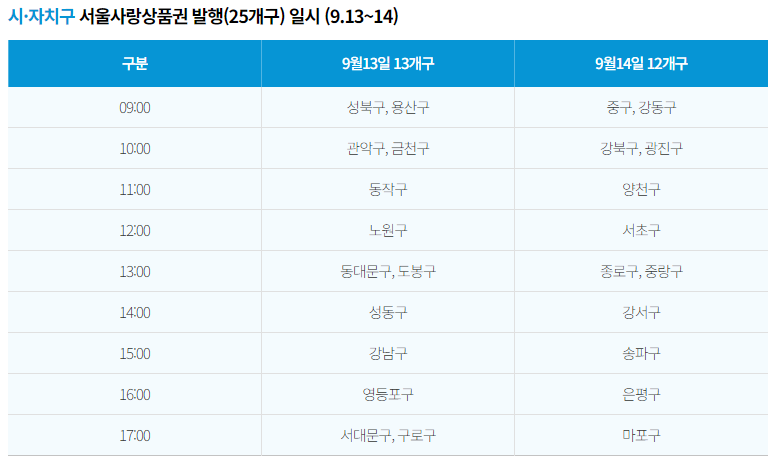 추석을 앞두고 서울시가 7% 할인된 금액으로 총 2,000억원 규모의 시·자치구 서울사랑상품권을 13일(13개구)과 14일(12개구) 양일간 발행한다.