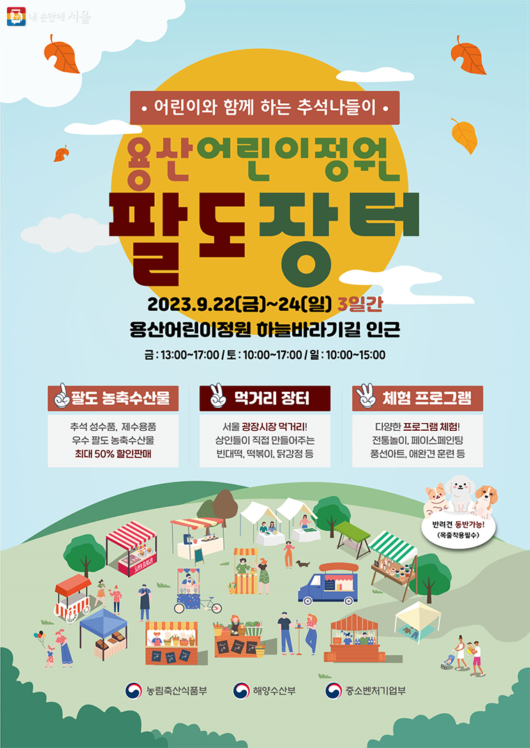 농림축산식품부, 해양수산부, 중소벤처기업부는 120년 만에 국민에게 개방한 용산어린이정원 하늘바라기길 인근에서 9월 22일부터 24일까지 ‘용산어린이정원 팔도장터’를 개최합니다.