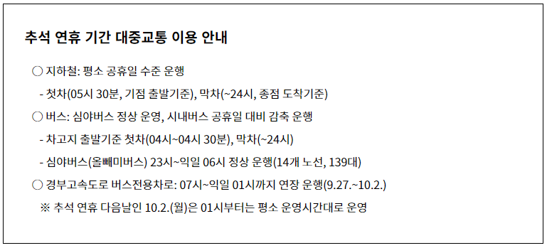 올 추석 연휴 동안 지하철은 공휴일 수준으로, 심야올빼미버스는 평소 수준으로 운행한다. 단, 긴 연휴로 인해 귀경 수요가 분산될 것으로 전망됨에 따라 이번 추석에는 대중교통 막차 시간을 연장하지 않는다.