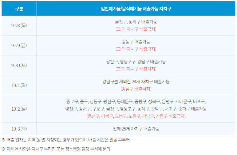 연휴 기간 쓰레기 배출은 자치구별로 쓰레기 배출일이 달라 유의해야 한다. 동별로 생활 쓰레기 배출일이 다른 자치구도 있으므로 자치구 누리집 등을 통해 미리 확인하는 것이 좋다.