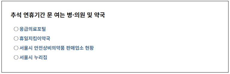 연휴 기간 진료 공백을 막기 위해 24시간 운영하는 응급의료기관 49개소와 응급실 운영병원 16개소, 약국 7,000여 개소를 지정·운영해 응급의료체계를 유지한다.