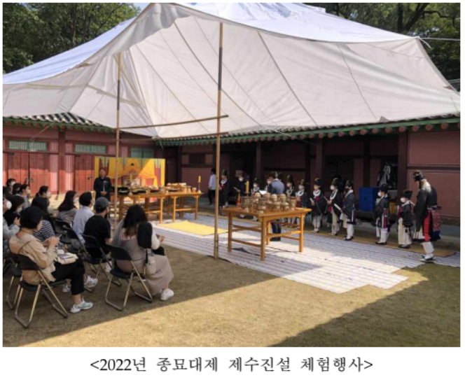 종묘대제는 조선왕실의 제례 중 가장 격식이 높은 의식으로, 어린이 참가자들은 제사 음식을 상 위에 직접 차려보는 제수진설에 참여하고, 제복을 착용해보는 등의 체험을 통해 종묘 제례에 진설되는 제수의 원형을 찾아보고 우리 고유의 제례 문화를 접하는 시간을 갖습니다.