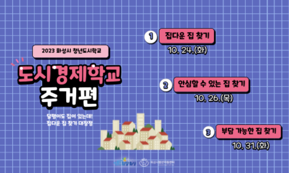 안녕하세요! 화성시청년지원센터HEY에서 2023 청년도시학교의 주거편 참여자를 모집합니다. 함께 일정과 프로그램을 살펴보고, 안심하고 살 수 있는 집을 찾아보세요. 아래는 참여 정보입니다.