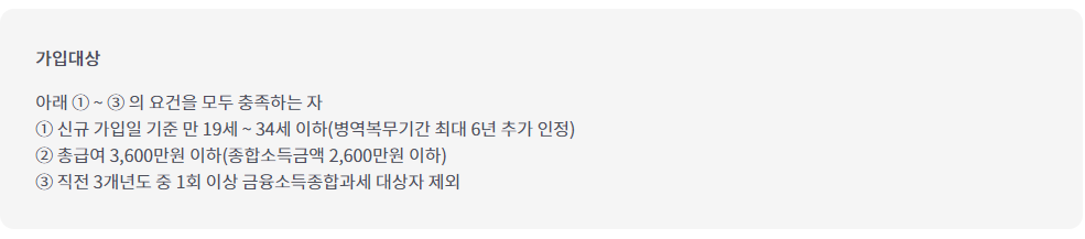 대한민국에 거주하는 만 19세~34세 청년 중에서 총급여 3,600만원이하의 청년들을 대상으로 지원하고 있으며,