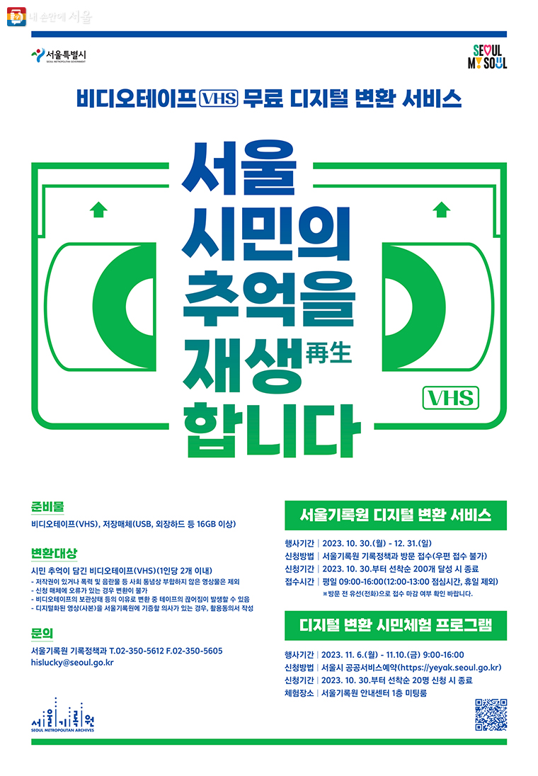서울기록원 홈페이지에서 이번 행사와 디지털 변환 서비스에 대한 자세한 내용을 확인할 수 있습니다. 또한, 기타 문의사항은 서울기록원 기록정책과(02-350-5612)로 문의하실 수 있습니다.