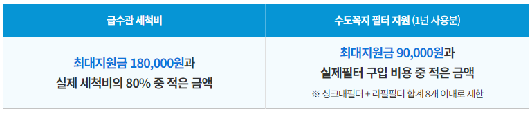 - 수도꼭지 필터: 최대 9만원까지 지원, 1년 사용분을 일시에 제공하며 45일에 한 번 필터를 교체할 수 있습니다.