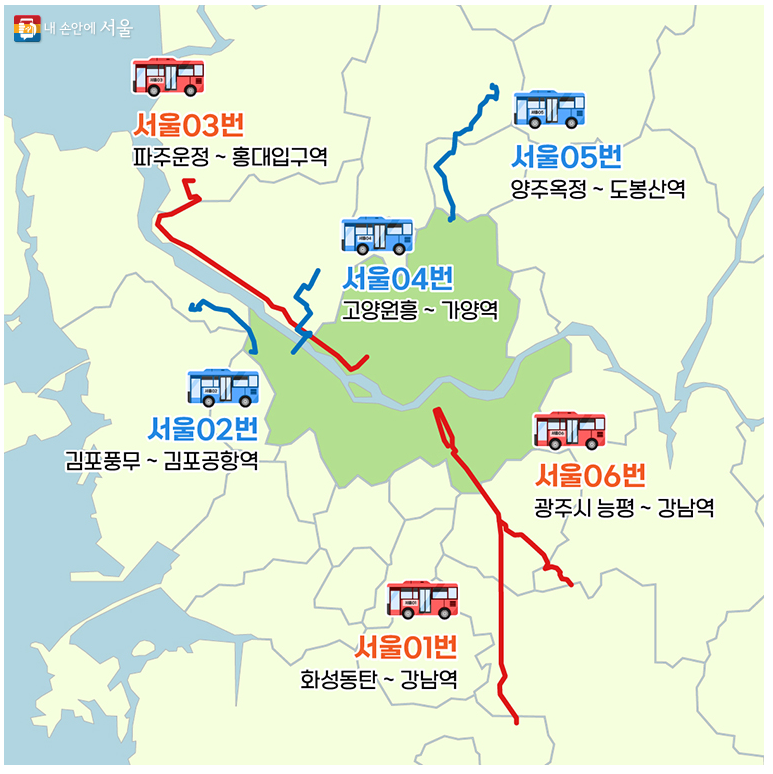 - 서울03번 - 파주 운정~홍대입구역 (06:20~07:00, 20분 간격, 3회)