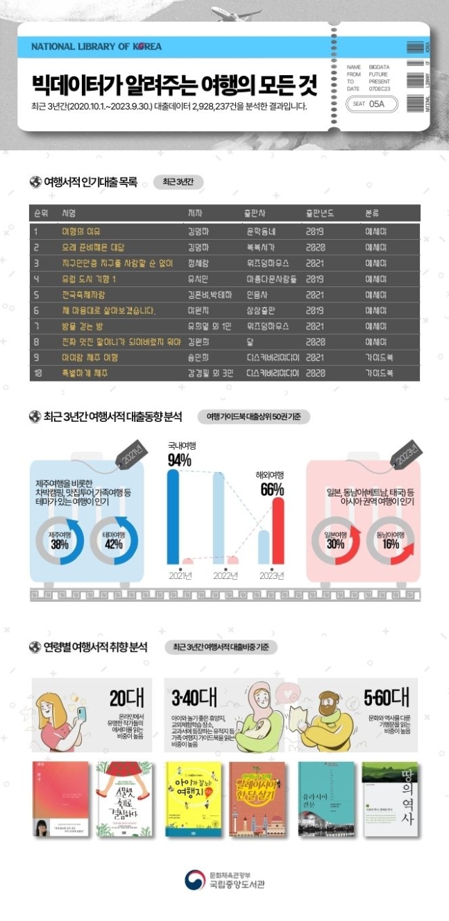 이처럼 국립중앙도서관의 빅데이터를 통해 확인된 여행 도서 대출 동향은 여행 트렌드 변화와 세대별 선호도서의 다양성을 보여주고 있습니다.