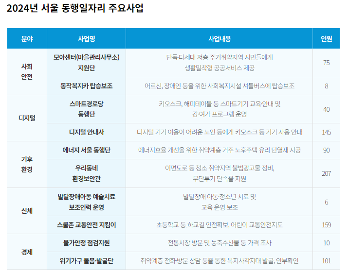 '서울 동행일자리 사업'은 다양한 분야에서의 일자리를 제공합니다. 신체적 약자 지원, 디지털 약자 지원, 기후환경 약자 지원 등 5개 분야에서 현장수요가 많은 대민활동 사업이 선정되었습니다.