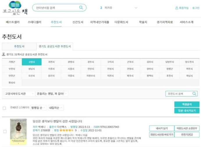 이처럼 흥미로운 주제의 추천도서를 통해 독자들은 다양한 선택지를 갖게 되었습니다. 또한, 독자들은 해당 서비스를 통해 인터넷 서점과 공공도서관 소장 장서에 대한 정보를 한 곳에서 확인할 수 있으며, 원하는 경우 31개 시·군 홈페이지와 연계하여 가까운 공공도서관에 희망도서를 신청할 수 있습니다.