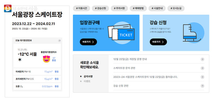 도심에서 운영되는 야외 스케이트장으로, 초미세먼지 수준이 일정 수준 이상일 경우 운영이 중단될 예정입니다. 대기오염도는 실시간으로 누리집을 통해 확인할 수 있으며, 중단 시에는 SMS와 현장에서 안내될 예정입니다.