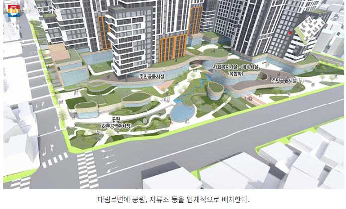 대림로변에 공원, 저류조 등을 입체적으로 배치하여 안전성을 강화하고 쾌적한 주거환경을 조성했습니다. 특히 침수로 인한 주민들의 불안을 해소하기 위해 침수피해 지역을 고려한 저류시설을 계획하였습니다.