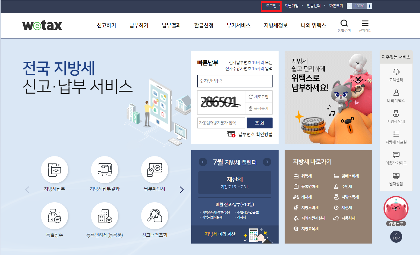 로그인을 하셨다면 납부할 재산세를 확인할 수 있습니다.