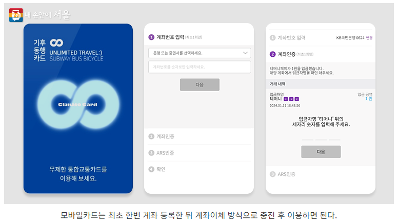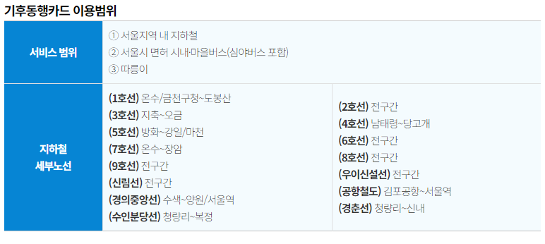 - 이용범위: 서울지역 지하철, 서울시 면허 시내·마을버스, 따릉이