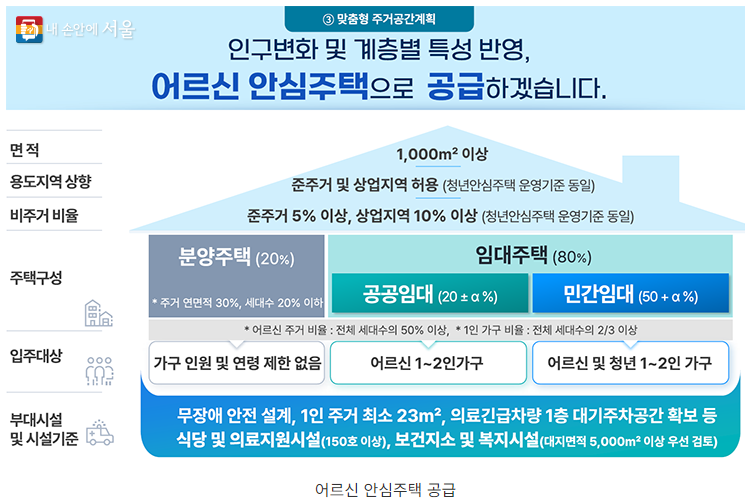 대한민국이 초고령사회로 진입하는 시대, 서울시는 고령자 주거 안정을 위해 '어르신 안심주택'을 추진합니다. 이 주택은 병원과 역세권에 위치하며, 시세보다 저렴한 임대료로 고령자들에게 안정된 주거환경을 제공하는데 중점을 둡니다.