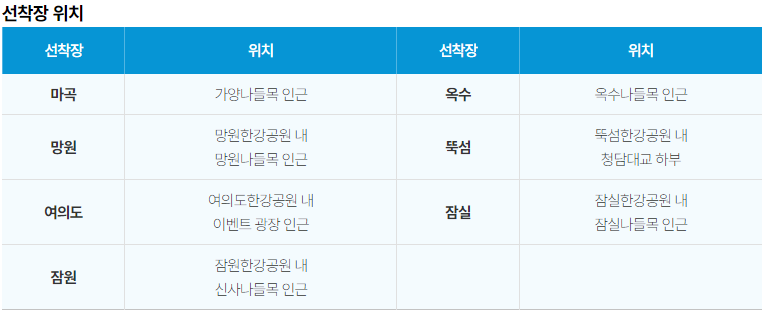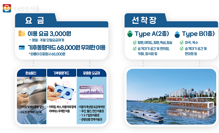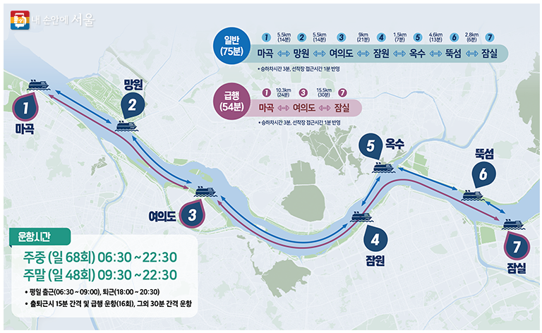 - 마곡~잠실 사이 7개 선착장, 길이 35m, 폭 9.5m