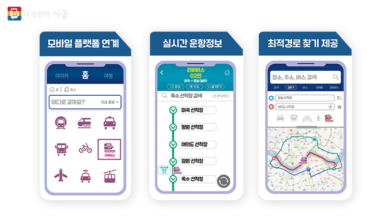 친환경 하이브리드 선박으로 운행되는 한강 리버버스는 이산화탄소 배출을 48% 감소시킴으로써 환경에 친화적입니다. 선박 내에는 휠체어석과 자전거 거치대 등이 설치되어 무장애 설계와 편리한 이용을 도모하고 있습니다.