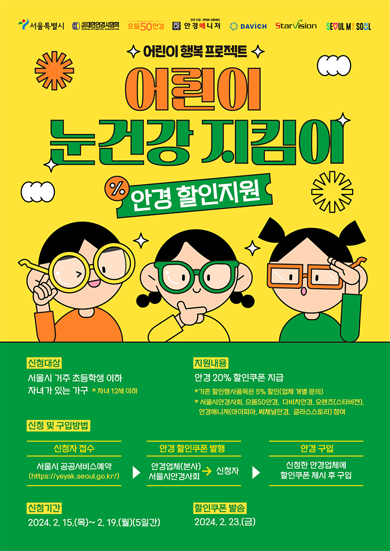 어린이들의 눈 건강을 위해 서울시와 민간 안경업체가 협력하여 눈 검진과 안경 구입 할인을 지원합니다. 새 학기를 맞아 초등학생 이하 자녀가 있는 가정의 많은 신청을 기대합니다.