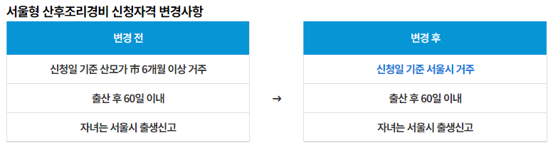 서울시는 '서울형 산후조리경비'를 받기 위해 6개월 이상 서울에 거주해야 한다는 요건을 폐지하고, 올해(2024.1.1. 이후) 출산한 모든 산모에게 적용한다고 밝혔습니다. 이는 서울시에서 출산한 모든 산모가 혜택을 받을 수 있도록 지원 장벽을 완화하기 위한 결정입니다.