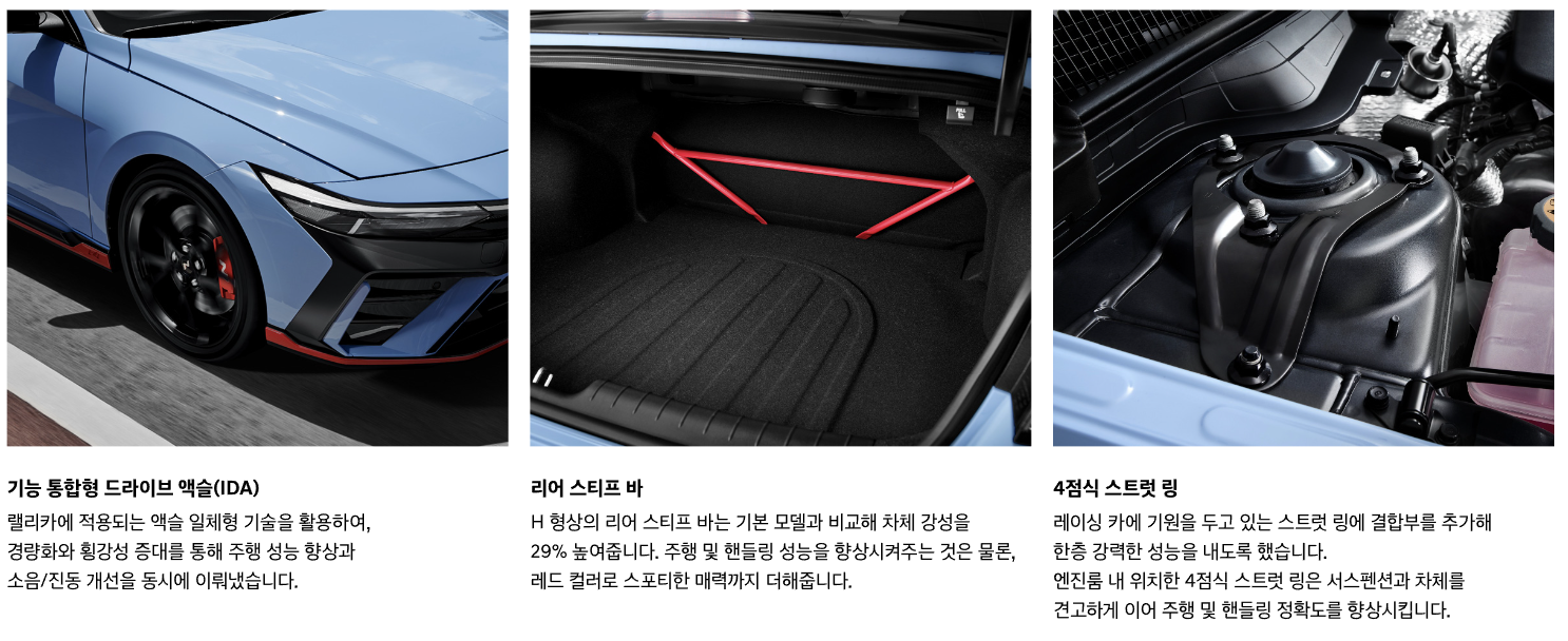 역동적인 운동성을 위해 IDA기술을 적용하였다는 점에서 '더 뉴 아반떼 N'은 운동성능에서만큼은 타의 추종을 불허한다고 보여집니다.