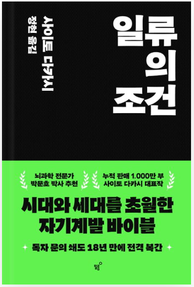 뇌과학 전문가 박문호 박사가 강력 추천하는 '일류의 조건'은 현대 사회에서 우리에게 필요한 능력과 성공의 비결을 밝힌 책입니다. 저자인 사이토 다카시는 다양한 분야의 일류들의 행동을 분석하여 그들이 성공을 이루는 과정과 필요한 능력을 조명합니다.