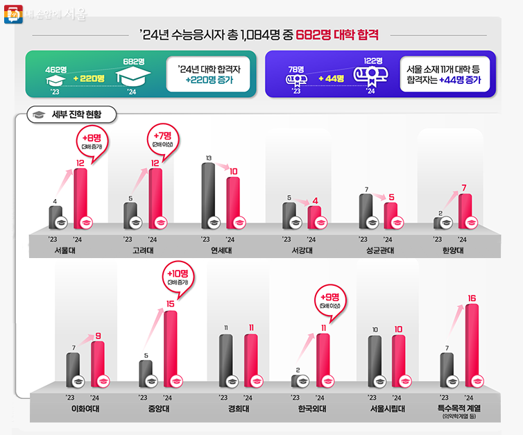특히, 서울대, 고려대, 중앙대 등의 합격생 수가 큰 폭으로 늘어났습니다.