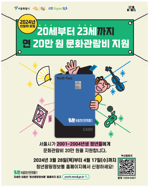 2024 서울청년문화패스 신청을 받습니다. 서울 거주 청년 중 가구소득이 중위소득 150% 이하인 20~23세 청년이 지원대상이며, 신청은 3월 28일부터 4월 17일까지 가능합니다.
