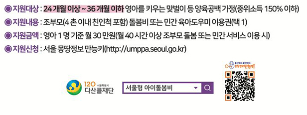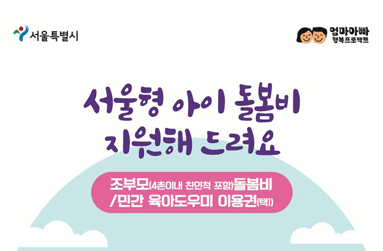 서울시는 할머니와 할아버지들을 위해 월 30만원의 아이돌봄비를 지급합니다. 이 프로그램은 엄마와 아빠들의 양육 부담을 줄여주며, 최근에 더욱 중요해진 조부모의 역할을 인정하는데 목적이 있습니다.