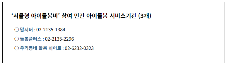 친인척이 돌봄을 지원하기 어려운 경우나 민간 아이돌봄 서비스를 선호하는 경우, 서울시와 협약을 맺은 민간 아이돌봄 서비스 기관을 통해 이용권(1명당 월 30만 원)을 제공할 예정입니다.
