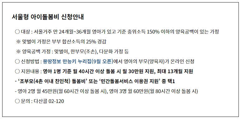 서울시는 오는 9월부터 '서울형 아이돌봄비' 사업을 추진하게 됩니다. 이 사업은 9월 1일부터 시작되는 출산 및 육아 종합 정보 플랫폼 '출산에서 육아까지 몽땅정보 만능키' (umppa.seoul.go.kr)를 통해 신청을 받을 계획입니다. '서울형 아이돌봄비'는 조부모를 포함한 4촌 이내의 친인척 육아 조력자가 아이를 돌보는 경우, 월 40시간 이상의 돌봄 활동 시 영아 1명당 월 30만 원씩 최대 13개월간 지원될 예정입니다. 이 지원금은 부모나 조력자의 계좌로 입금되며,