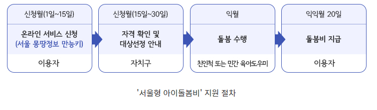 이를 위해 서울시는 3개의 서비스 기관을 선정하고, 서울시, 25개 자치구, 민간 기관 간의 5자 협약을 체결할 예정입니다. 더 자세한 '서울형 아이돌봄비'의 지원 조건 및 절차는 9월에 오픈 예정인 '출산에서 육아까지 몽땅정보 만능키' 누리집을 통해 확인할 수 있으며, 매월 1일부터 15일까지 양육자가 온라인으로 '몽땅정보 만능키'를 통해 신청할 수 있습니다. 신청이 접수되면 각 자치구에서 자격 확인 후 지원 대상을 선정하고 안내하며, 다음 달부터 돌봄 활동을 시작할 수 있습니다.
